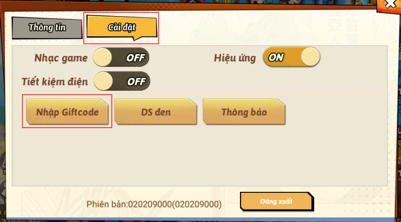 - Bước 2: Chọn Cài Đặt -> Nhập Giftcode -> Điền mã và xác nhận