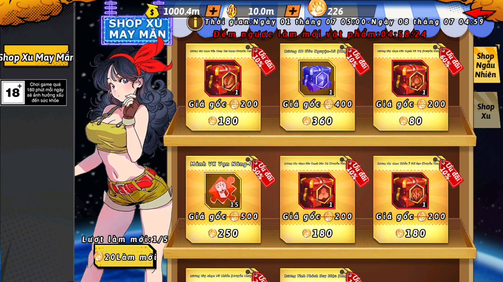 3. Vật phẩm Shop Ngẫu Nhiên sẽ làm mới và giảm giá vào 10:00, 12:00, 14:00, 16:00, 18:00, 20:00, 22:00 mỗi ngày. Người chơi dùng Xu May Mắn để làm mới Shop, trong SK, tối đa là 5 lần.