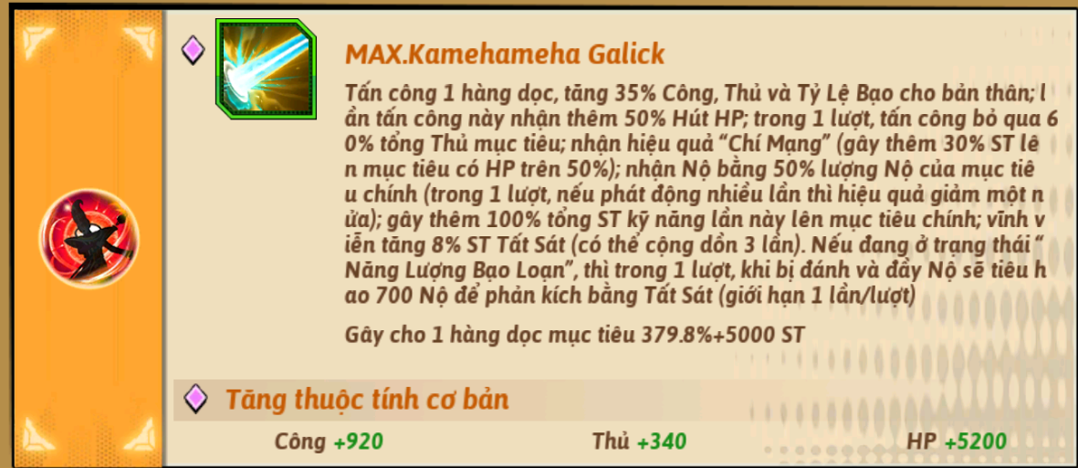 Tấn công 1 hàng dọc, tăng 35% Công, Thủ và Tỷ Lệ Bạo cho bản thân; lần tấn công này nhận thêm 50% Hút HP; trong 1 lượt, tấn công bỏ qua 60% tổng Thủ mục tiêu; nhận hiệu quả “Chí Mạng” (gây thêm 30% ST lên mục tiêu có HP trên 50%); nhận Nộ bằng 50% lượng Nộ của mục tiêu chính (trong 1 lượt, nếu phát động nhiều lần thì hiệu quả giảm một nửa); gây thêm 100% tổng ST kỹ năng lần này lên mục tiêu chính; vĩnh viễn tăng 8% ST Tất Sát (có thể cộng dồn 3 lần). Nếu đang ở trạng thái “Năng Lượng Bạo Loạn”, thì trong 1 lượt, khi bị đánh và đầy Nộ sẽ tiêu hao 700 Nộ để phản kích bằng Tất Sát (giới hạn 1 lần/lượt)