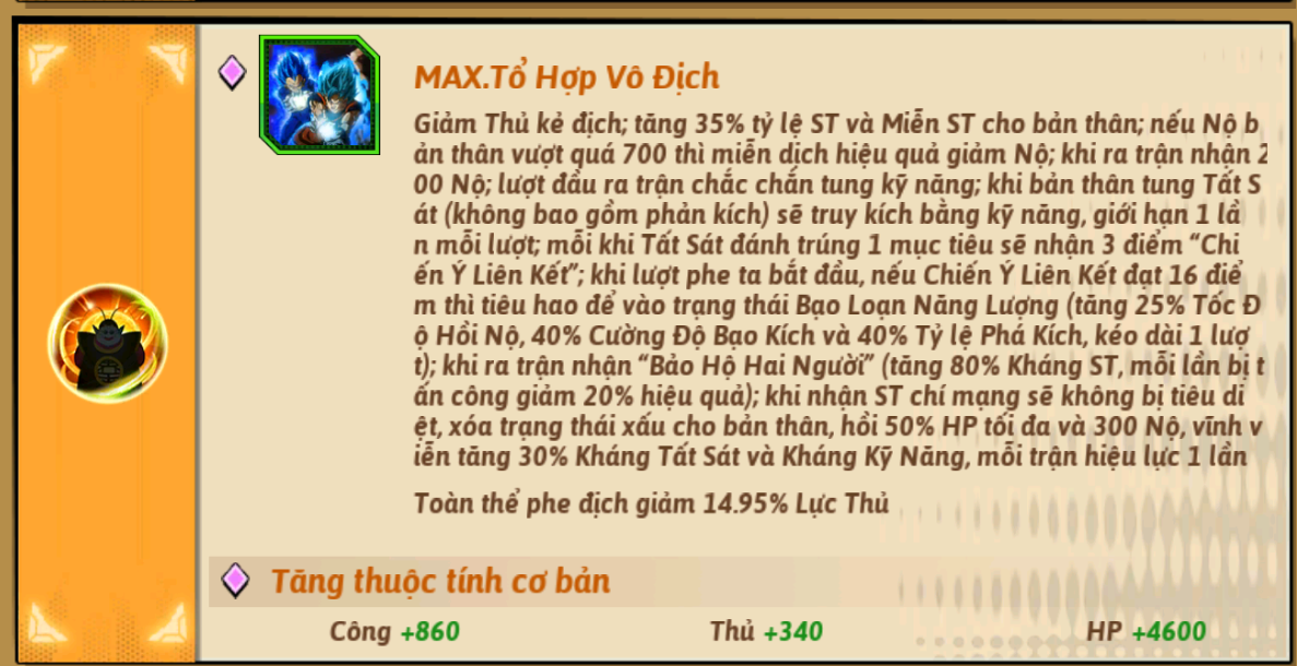 Giảm Thủ kẻ địch; tăng 35% tỷ lệ ST và Miễn ST cho bản thân; nếu Nộ bản thân vượt quá 700 thì miễn dịch hiệu quả giảm Nộ; khi ra trận nhận 200 Nộ; lượt đầu ra trận chắc chắn tung kỹ năng; khi bản thân tung Tất Sát (không bao gồm phản kích) sẽ truy kích bằng kỹ năng, giới hạn 1 lần mỗi lượt; mỗi khi Tất Sát đánh trúng 1 mục tiêu sẽ nhận 3 điểm “Chiến Ý Liên Kết”; khi lượt phe ta bắt đầu, nếu Chiến Ý Liên Kết đạt 16 điểm thì tiêu hao để vào trạng thái Bạo Loạn Năng Lượng (tăng 25% Tốc Độ Hồi Nộ, 40% Cường Độ Bạo Kích và 40% Tỷ lệ Phá Kích, kéo dài 1 lượt); khi ra trận nhận “Bảo Hộ Hai Người” (tăng 80% Kháng ST, mỗi lần bị tấn công giảm 20% hiệu quả); khi nhận ST chí mạng sẽ không bị tiêu diệt, xóa trạng thái xấu cho bản thân, hồi 50% HP tối đa và 300 Nộ, vĩnh viễn tăng 30% Kháng Tất Sát và Kháng Kỹ Năng, mỗi trận hiệu lực 1 lần